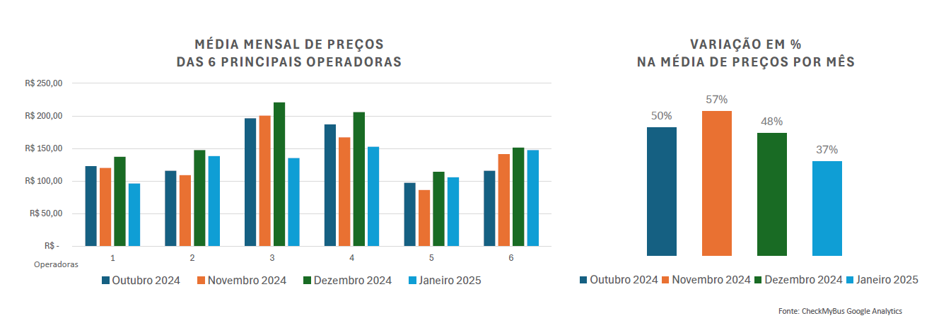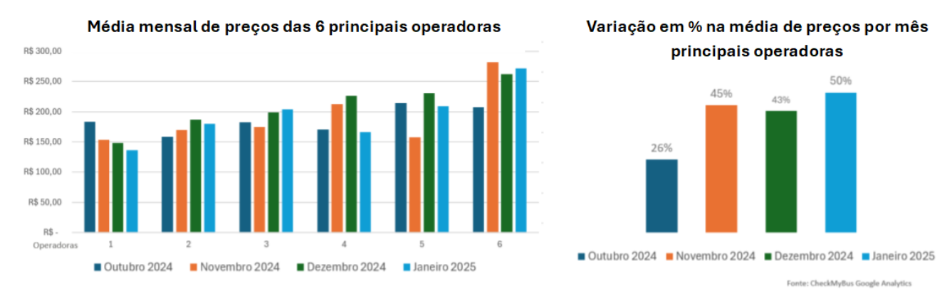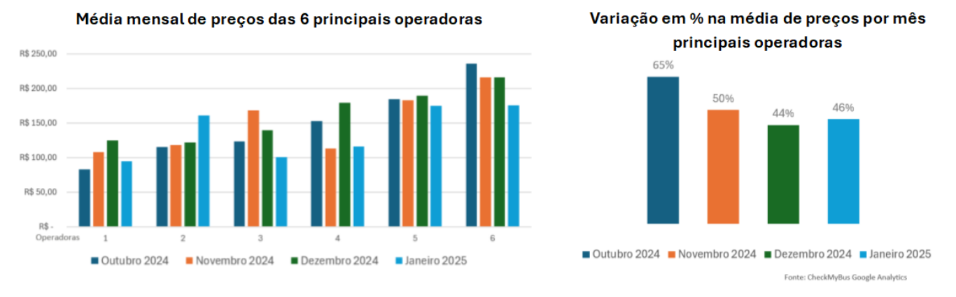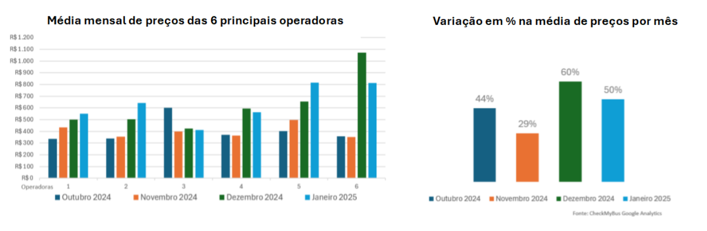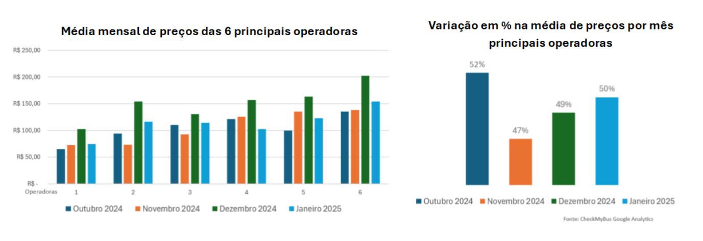 O estudo comparou a média de preços das empresas de ônibus que operam 5 rotas com grande procura de passageiros, revelando um cenário bastante dinâmico. Enquanto algumas empresas mantiveram seus preços mais estáveis ao longo dos meses, outras apresentaram variações consideráveis durante o recente período de férias e grande demanda.